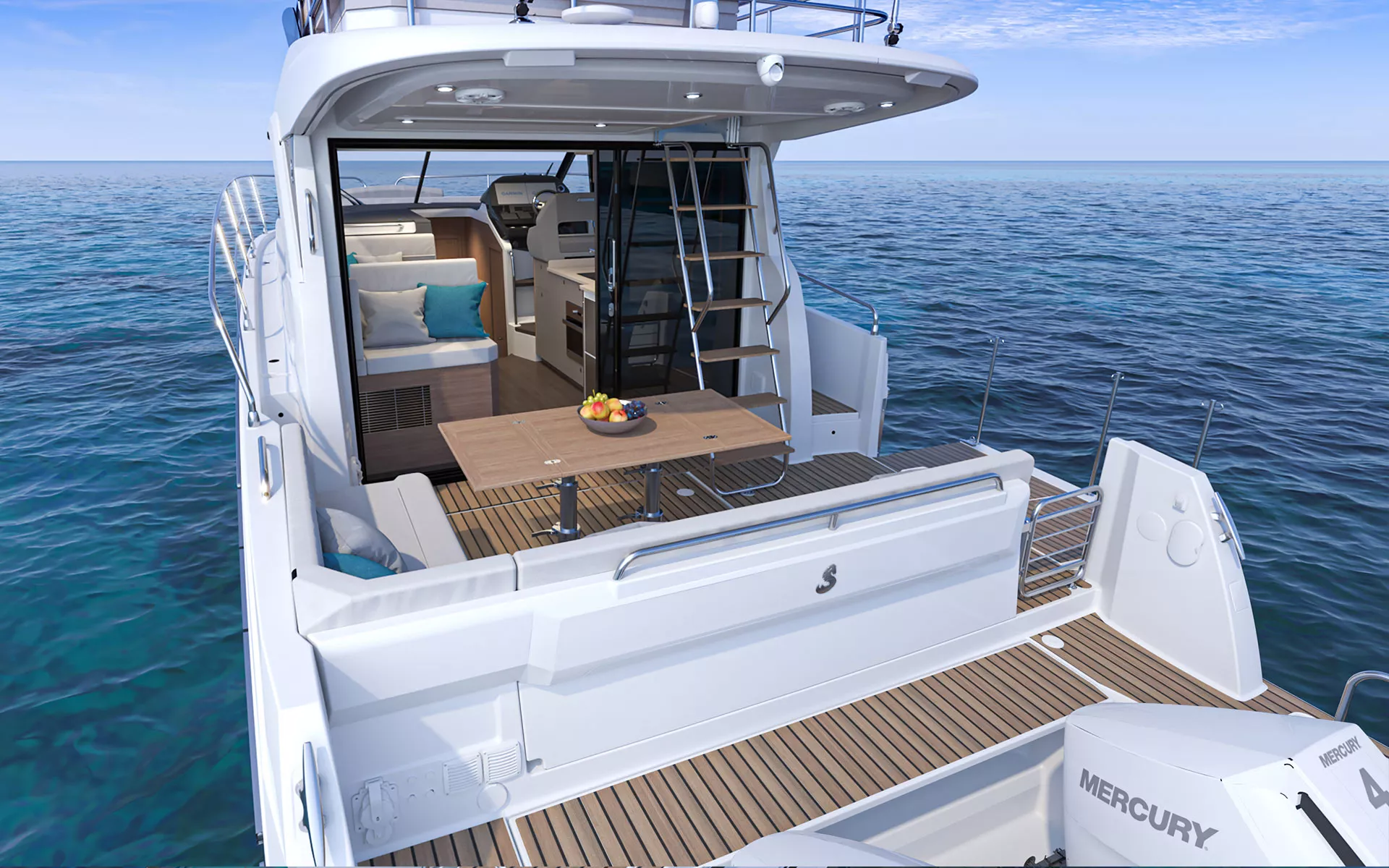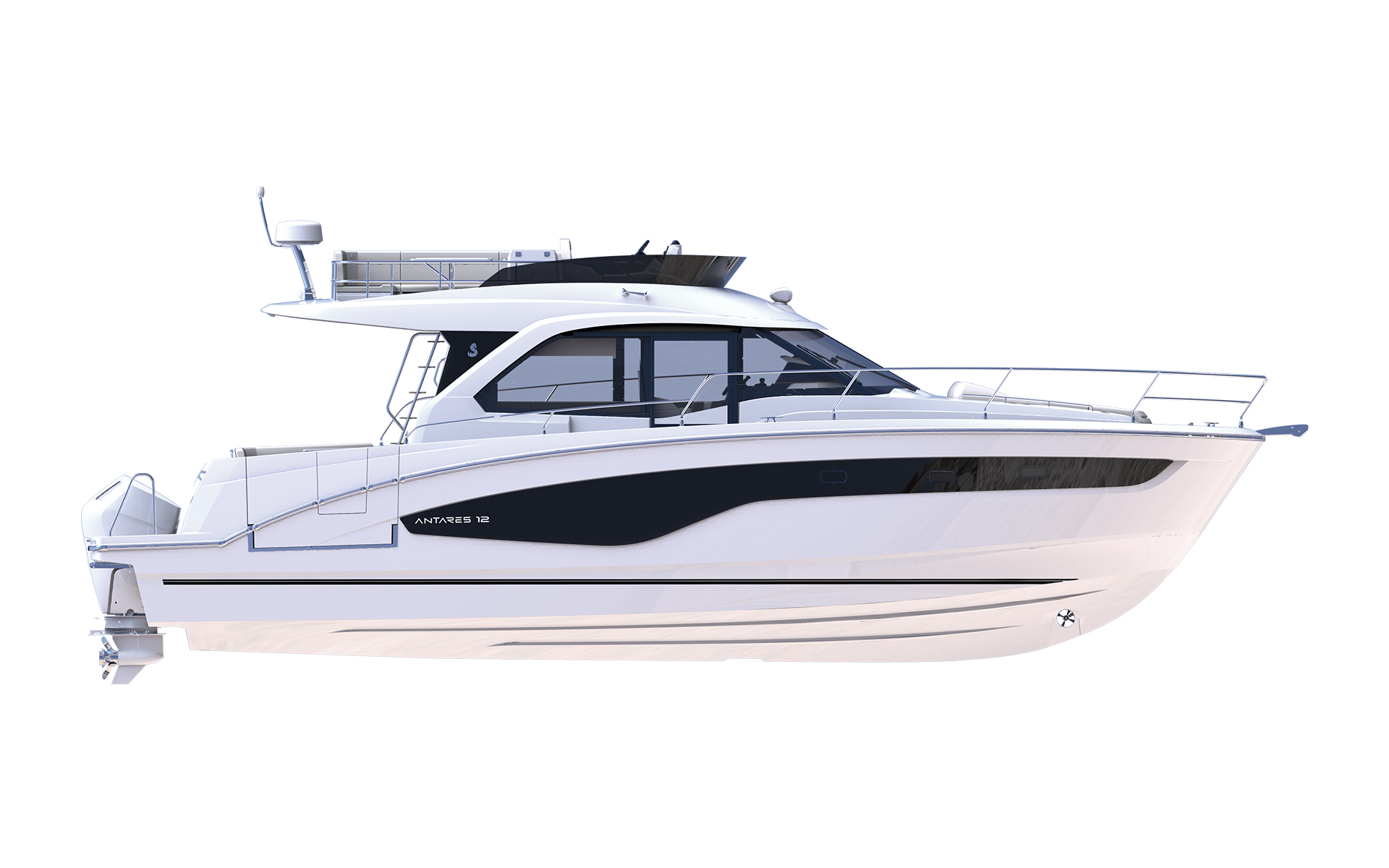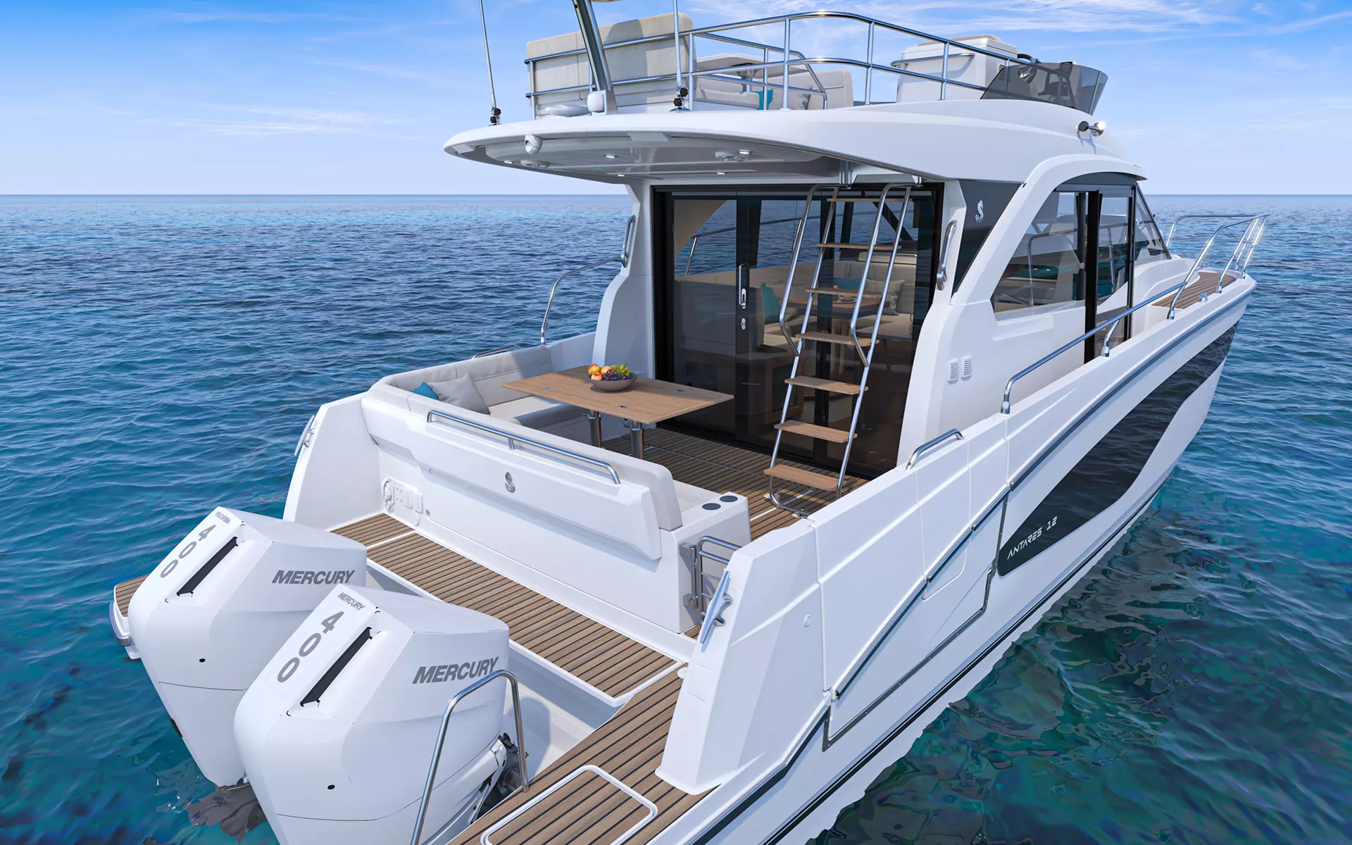 Dotée d’une esthétique racée, l’Antares 12 Fly multiplie les zones de vie pour que chaque membre de l’équipage trouve sa place. Le bateau offre trois espaces de détente distincts : le cockpit arrière protégé par une longue casquette, le bain de soleil avant avec dossier relevable, et surtout, un Flybridge spacieux. Ce dernier est un véritable salon panoramique avec son canapé d’angle et sa cuisine d'été équipée. Autre innovation majeure : la plateforme latérale s’ouvrant sur la mer, prolongeant le cockpit pour faciliter la baignade et les activités nautiques.
