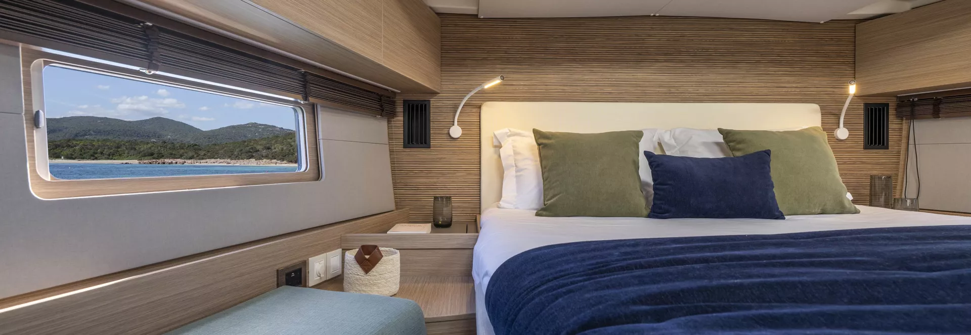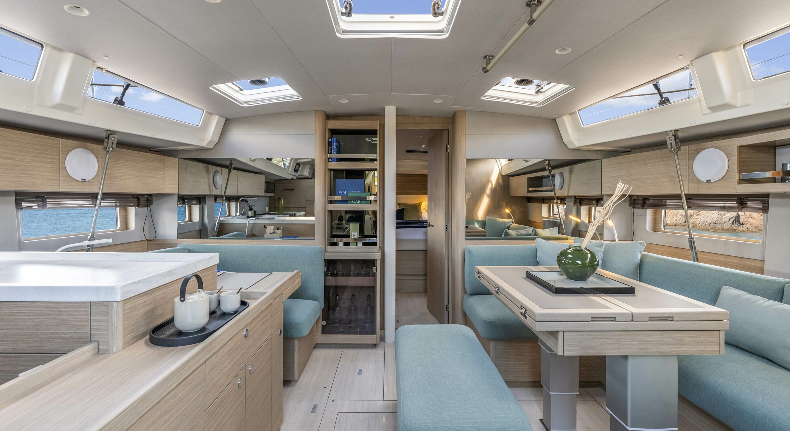 Sous le pont, la descente en pente douce mène à un espace de vie exceptionnel. La cuisine en "C" est digne d'une maison avec son réfrigérateur pleine hauteur, ses plans de travail en Corian et son passe-plat pratique. Le carré, habillé de boiseries en chêne sable, propose une sellerie moelleuse avec des mousses épaisses. Chaque détail, des spots anti-éblouissement aux éclairages LED blanc chaud sur variateur, a été pensé pour créer une atmosphère intime et raffinée lors de vos croisières familiales.